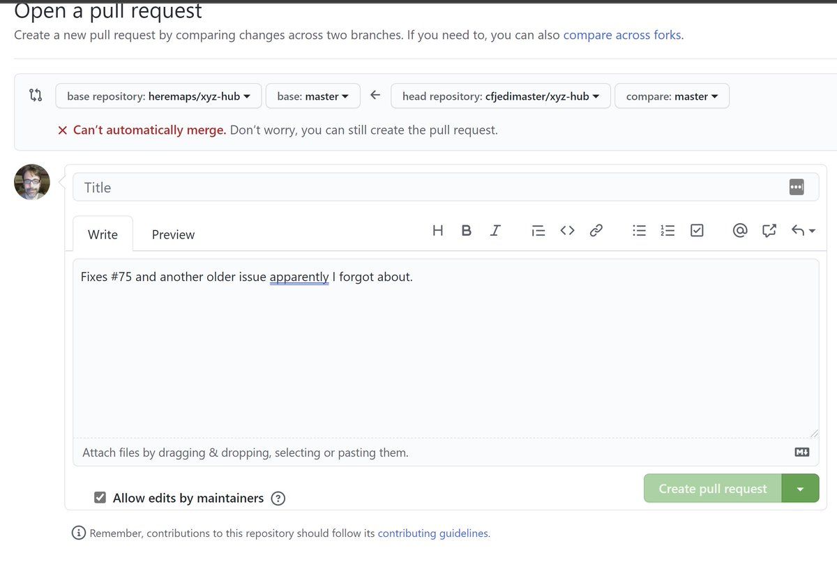 Anyone know why the pull request button is disabled? The text on top says it can't be automatically merged, but does clearly say I can still make the PR.