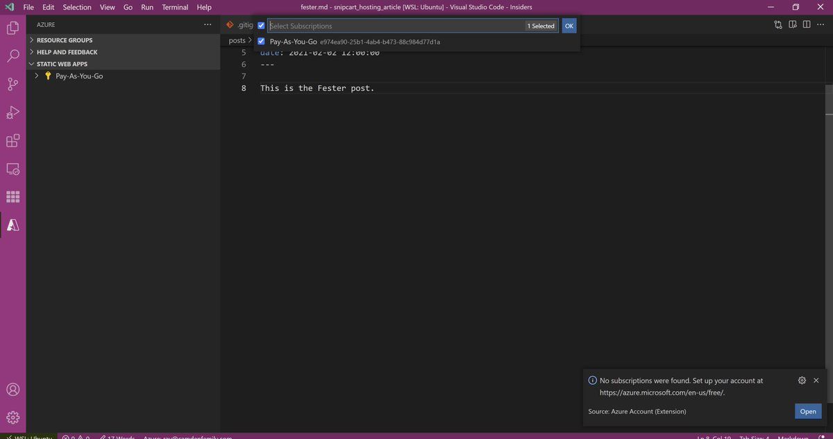 1. Hey MicrosoftAzure folks - I've got the Static Web Apps open in Code. I had to renew my Azure sub as a "Pay As You Go" user. But Code says I don't have "Subscriptions". In the Azure portal, I see resources, I don't see subscriptions, so I'm suck.