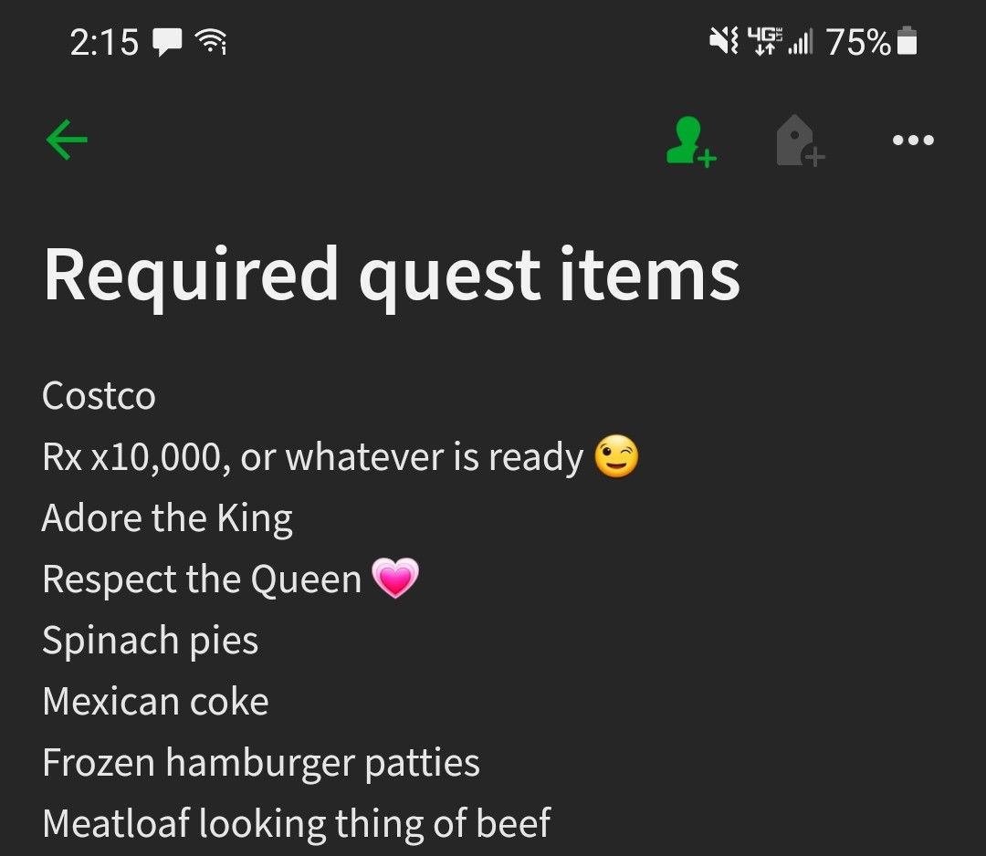 Love is writing cute (ok to us) notes to each other in the shared note for shopping.
