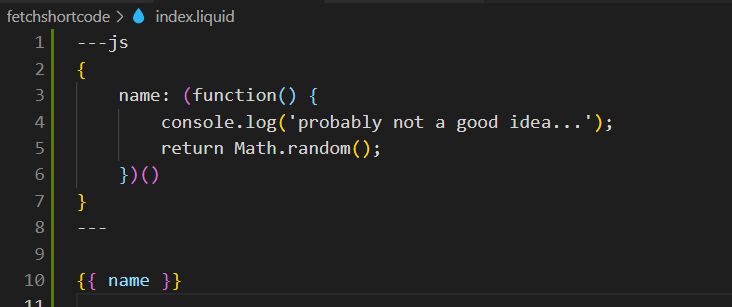 - when using JS frontmatter, if you define a value as a function, Liquid can't use it. However, if you want to use a func that runs just once, you _can_ use an IIFE.