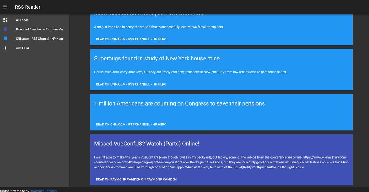 Little something I'm working on: RSS Reader using Vue, Vuetify. First rev just persists feeds. Second rev will remember downloaded items in IndexedDB.